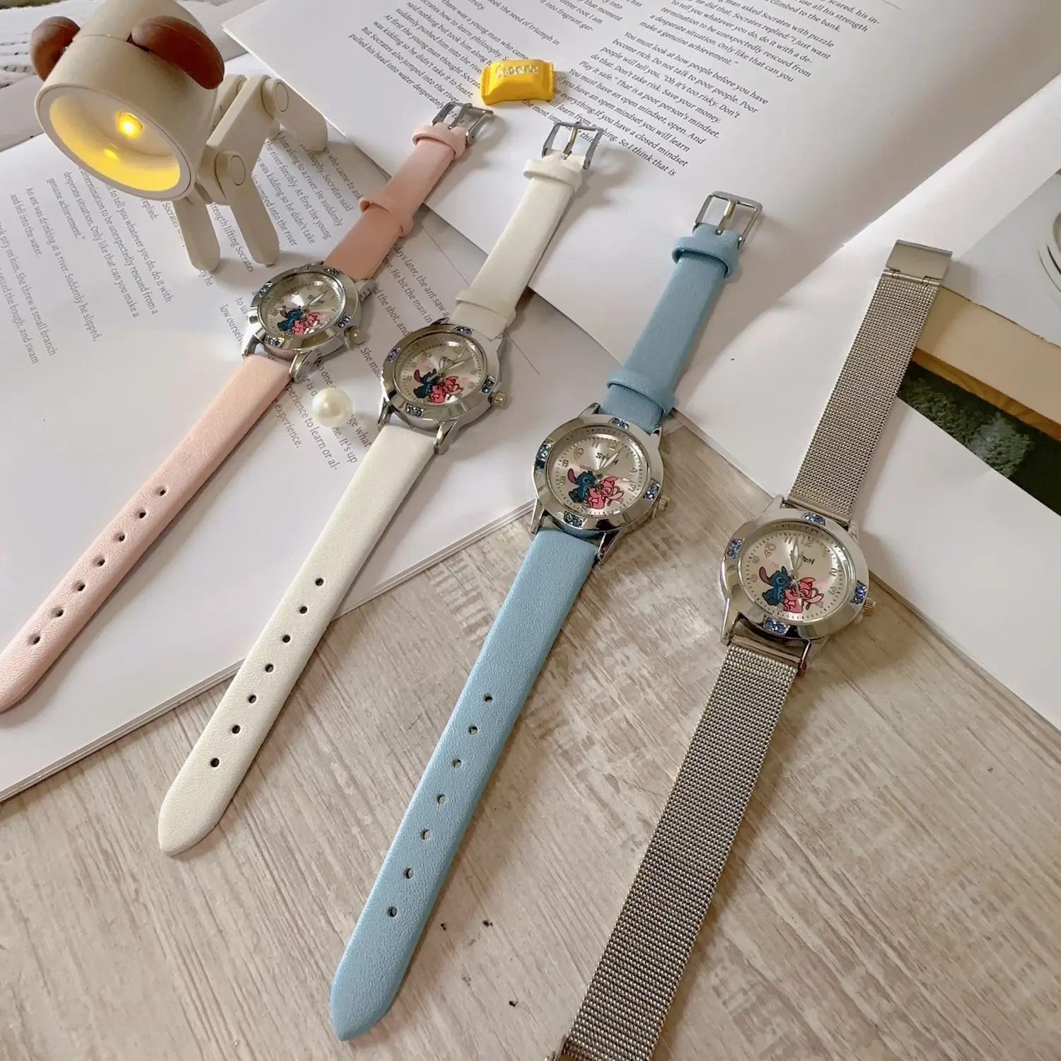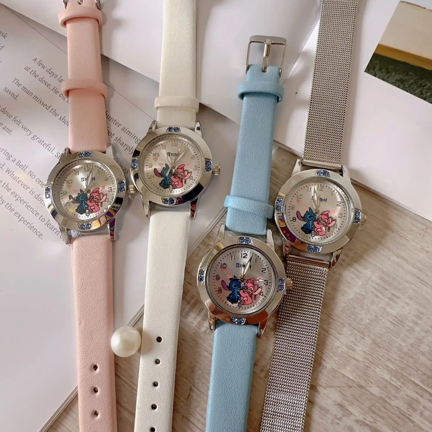 Anime Figures Disney Stitch Girl’s Watches Diamond Quartz Watch Boys Girls Stitch Cartoon Leather Wristwatches Kids Toys Gifts
