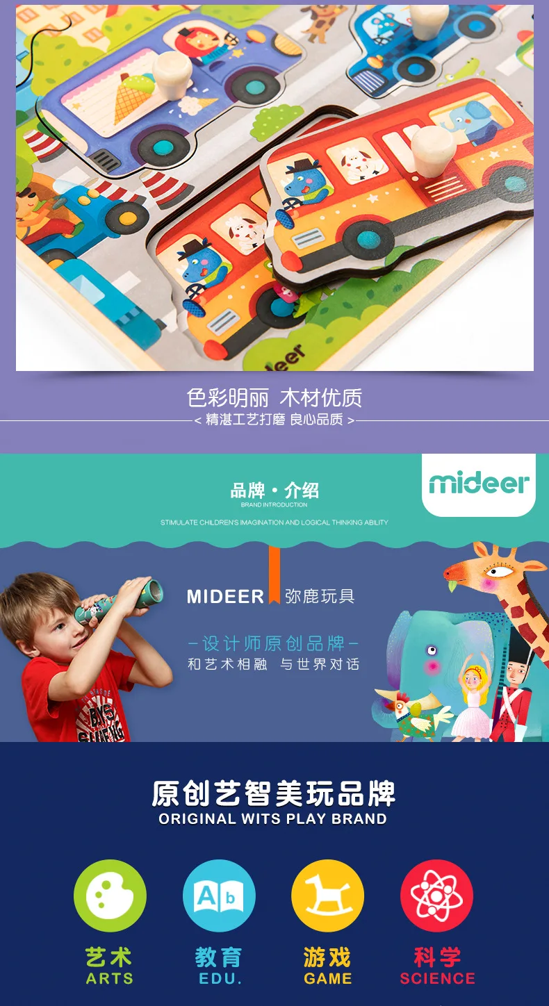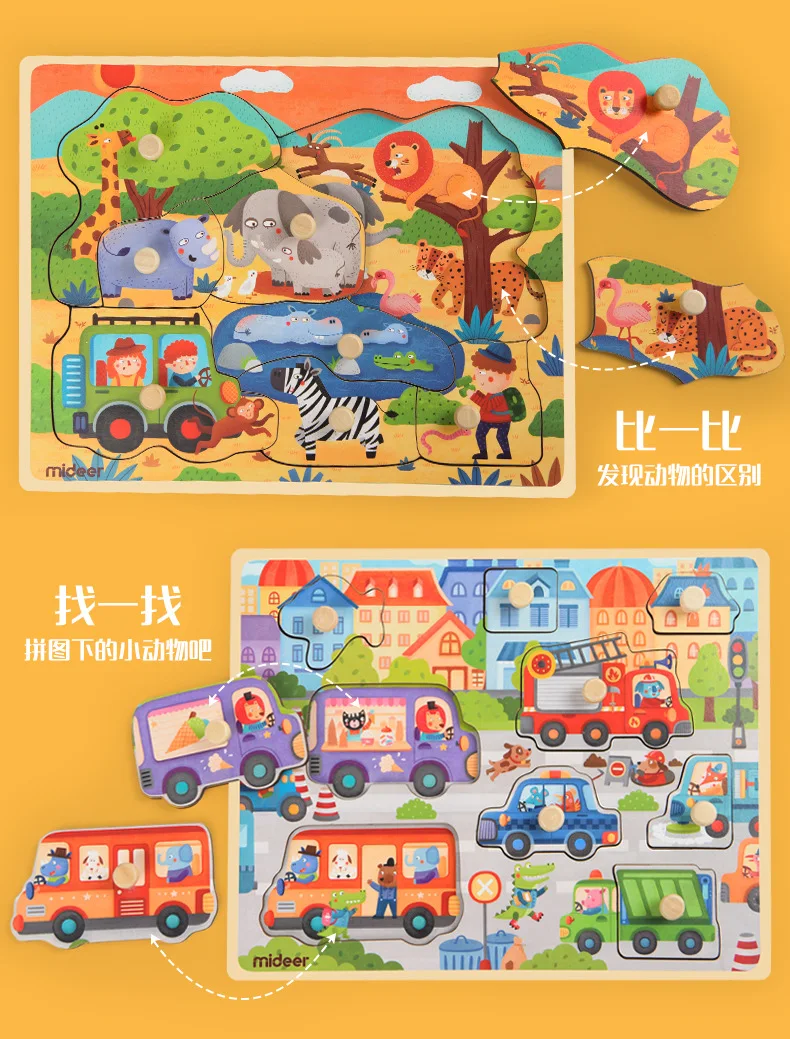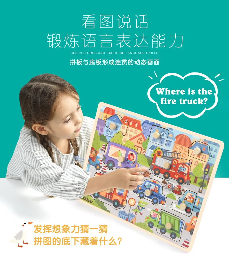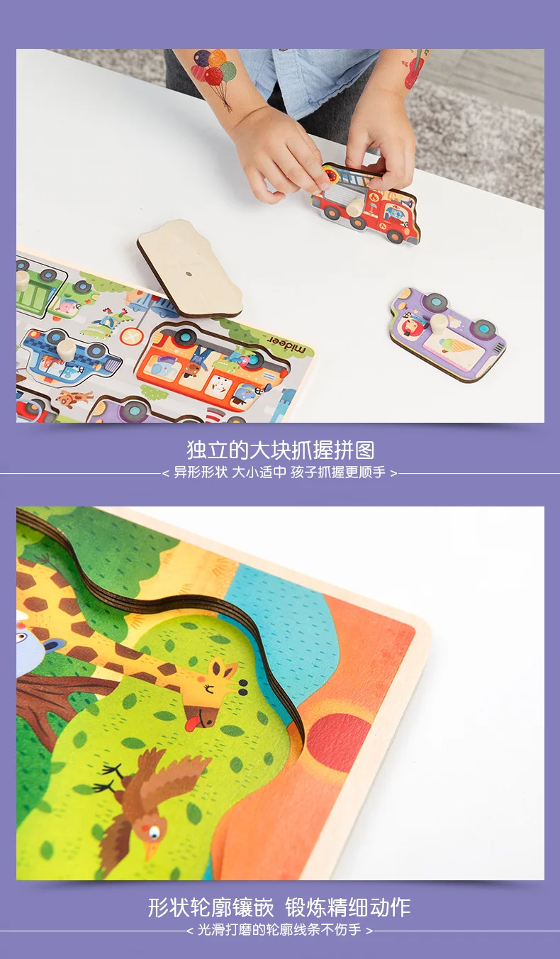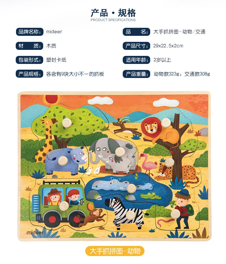 Mideer Children Wooen Bulk Hand Grab Puzzle Baby Traffic Animals Puzzle Kids Cognitive Enlightenment Early Learning Puzzle